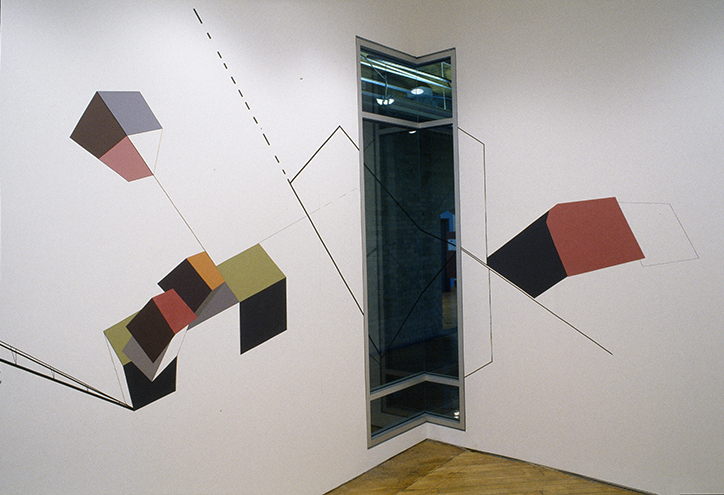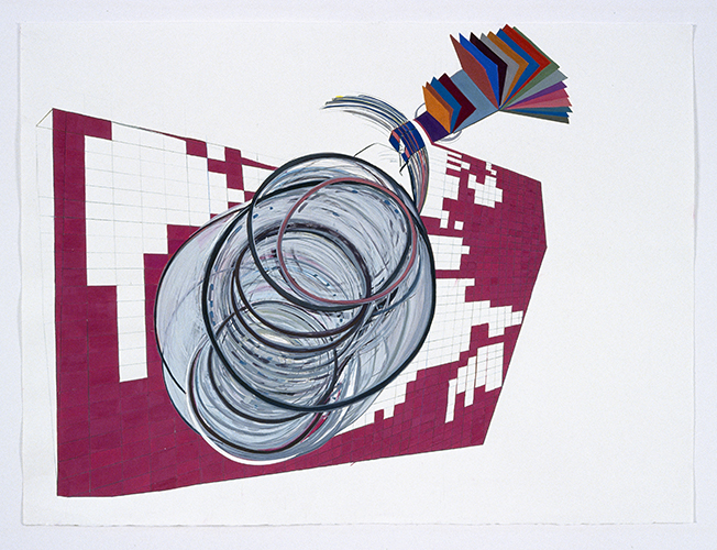 Conundrum presented at the Wynick/Tuck Gallery, Toronto included a series of paintings on paper installed in the Wynick/Tuck South Gallery and a site specific wall painting installation set in the gallery’s Project Room. The paintings seemed like fictitious topographies, capturing the movement and speed I imagines of information playfully spinning and whizzing through cyberspace. The images are constructed by combining different perspective views and elevations within the picture plane. The flat, coloured swatches not only refer to the use of digital reproduction, but also allude to the history of modern colour field painting. Again two-dimensionality and three-dimensionality compete for space in the picture plane, while I also contends with the more abstract concept of the fourth dimension, informed largely by the work of Russian Suprematist Kasimir Malevich and of Theo van Doesburgh.