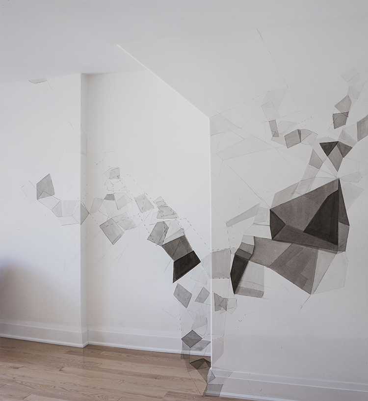 Working on a new body of work that hearken back to my pursued interest in temporality, presence and absence, and space. Venturing into a new territory, I began photographing bare interior spaces (gallery walls, domestic interiors, bare walls). Printing these photos into a 30 x 40-inch format, I then draw and paint with ink and gouache on the print, to toy with perception and spatiality. The result is confounding. These works read simultaneously as reproductions of site-specific wall work and painting on paper; they are situated between matter and space. The work questions what is true and what is not; what is digitally rendered and what is manually added. This approach to art-making speaks to my on-site practice of producing site-specific wall work.